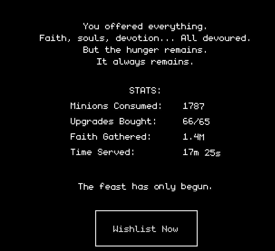 Good game, 1783 minions consumed, 66 out of 65 upgrades bought (somehow) 1.5 milion faith gathered, 15m 45s